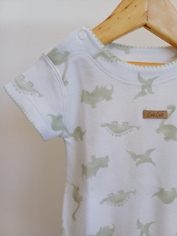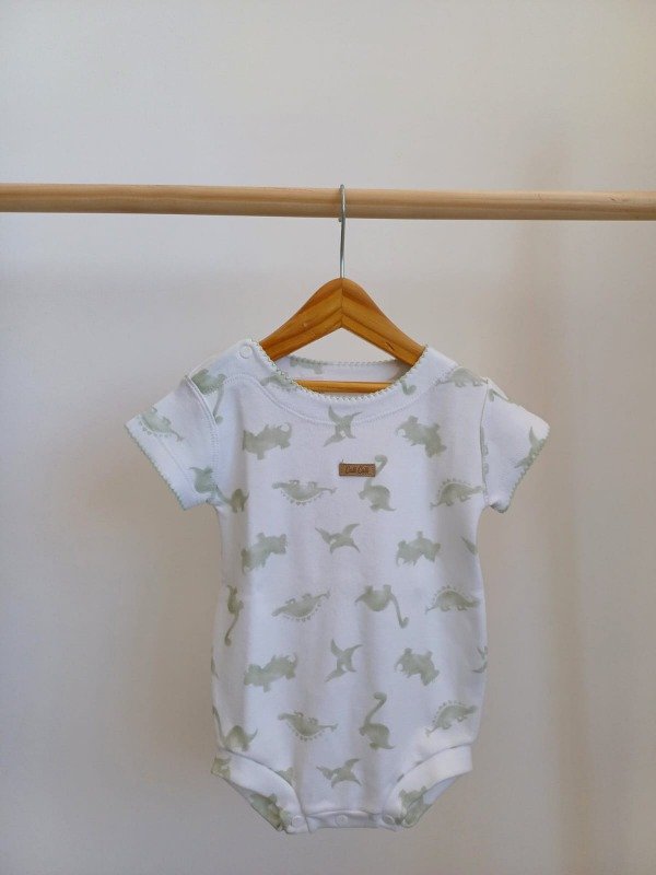 Body manga corta 100% algodon con estampa de dinosauros, muy facil de combinar, terminacion en picott y con broche de plastico del mismo color que permite el facil cambiado del bebe