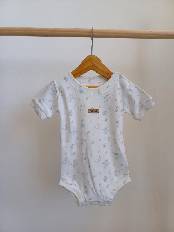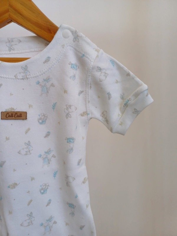 Body 100% algodon con estampa de conejos color aqua y beige y terminaciones con detalles en picot
