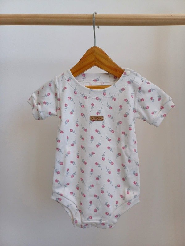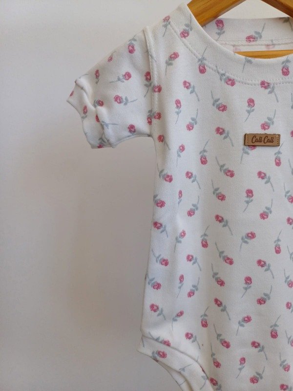 Body 100% algodon con estampa de rosas, botones de plastico del mismo tono y terminaciones con detalles en picot