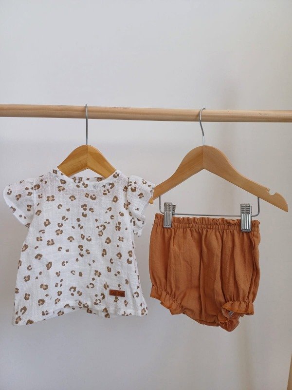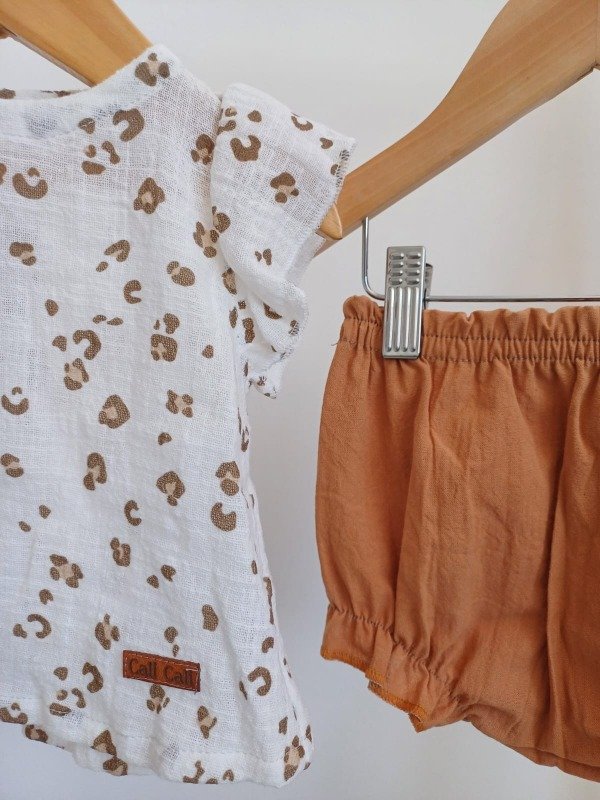 Conjunto animal print de dos piezas con camisola de gasa con broches de plasticos en la espalda y bombachudo en tusor con elastico en cintura y piernas
