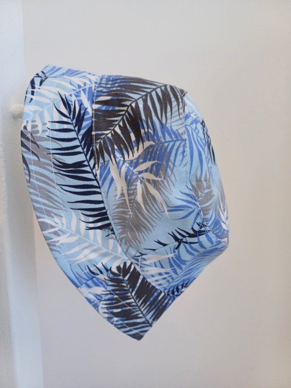 Piluso ideal para este verano con estampa de hojas color azul con tapa costura y con un diametro de la cabeza de 45cm