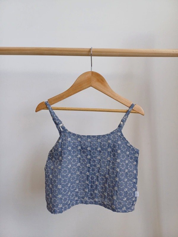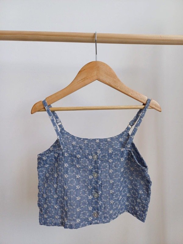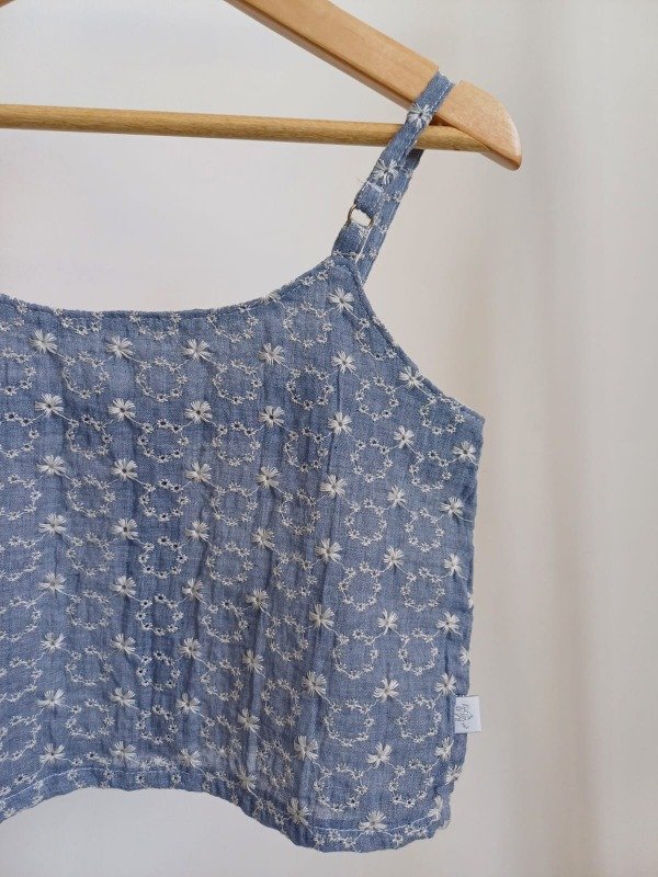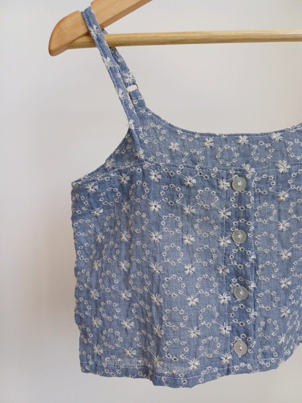 Camisola de jean con bordados de flores, breteles regulables y botones en espalda