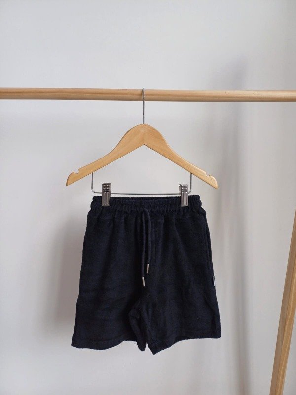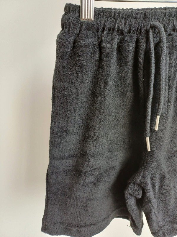 Bermuda de towel color negra con elastico en cintura, cordon regulable y bolsillos