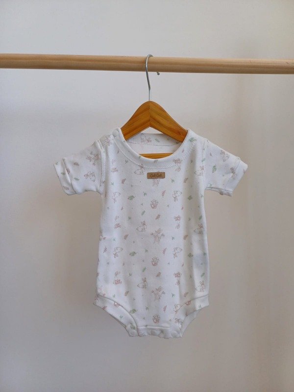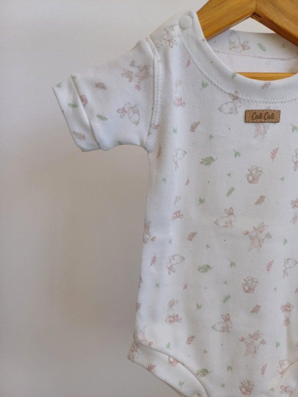 Body 100% algodon con estampa de conejos color rosa y beige y terminaciones con detalles en picot