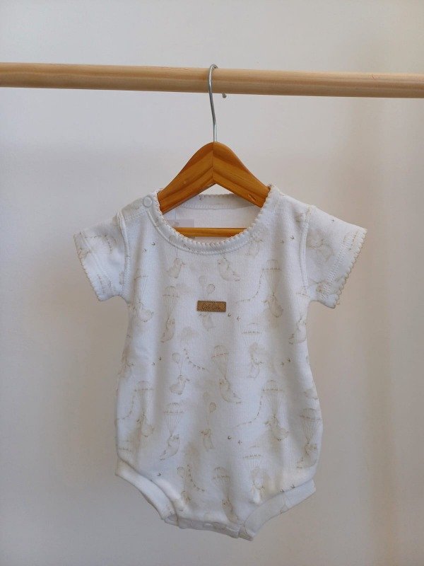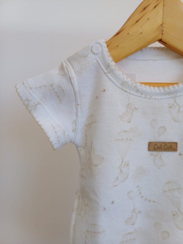 Body 100% algodon con estampa de conejitos en beige, botones en plasticos en el mismo tono y terminaciones con detalles en picot